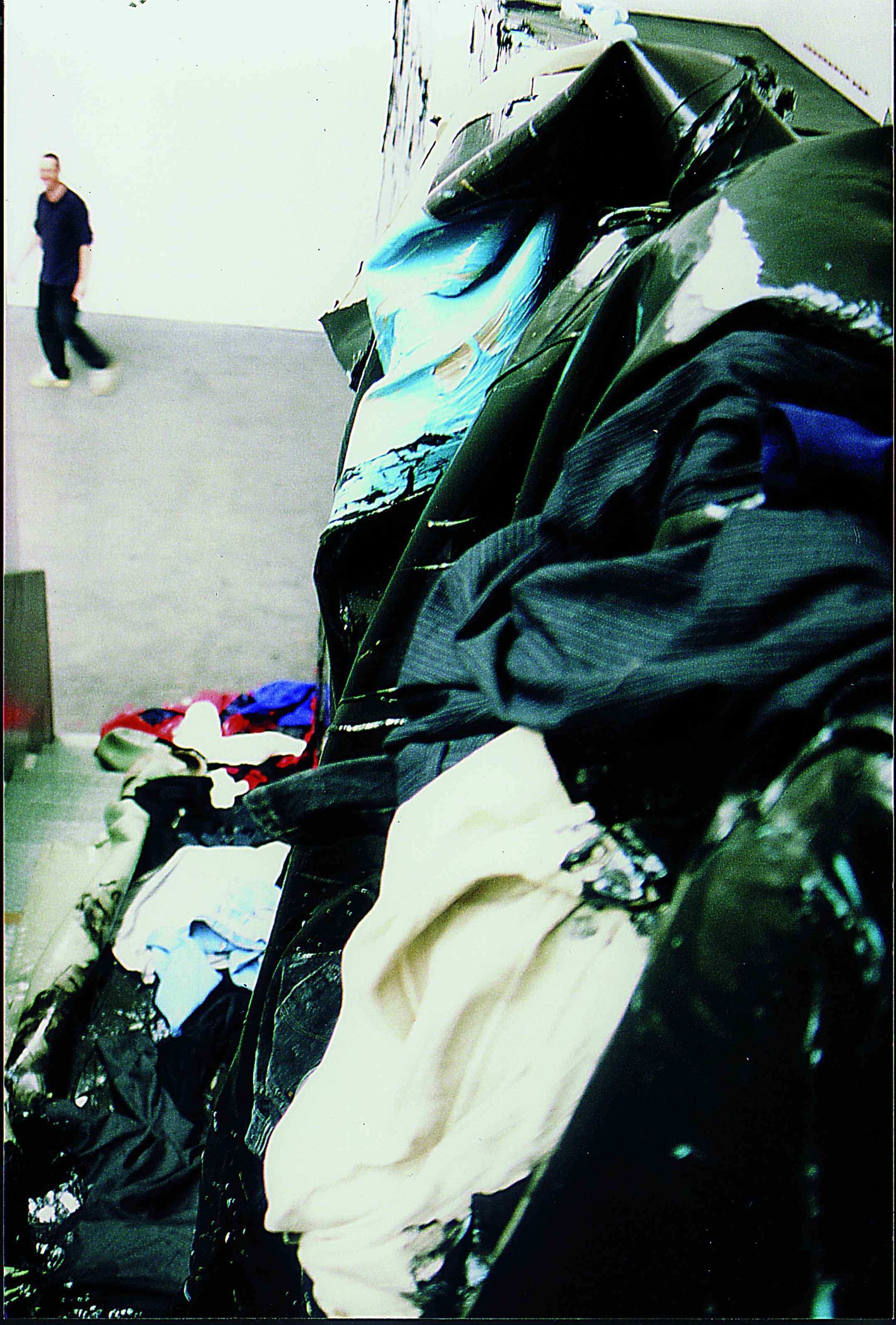 SC: Ja, das war dann der Punkt. Also: „welches Material kommt in Frage?“ Da ging dann noch einmal Zeit ins Land. Ein Jahr lang habe ich mit Materialien experimentiert. Verschiedenste Kunststoffe, die sich wie eine Ölpaste mit einem Pinsel aufbringen lassen. Auch diese Pastosität war mir sehr wichtig, der Duktus war mir wichtig. Das war meine Handschrift, die darin steckt. Die Suche war natürlich sehr komplex, weil solche Produkte ewig durchprobiert werden mussten. Denn wer mit Kunststoff malt/ Acryl wäre so eine Form, die sich angeboten hätte. Aber das war nicht das passende Material, denn so eine Acrylhaut ist relativ tot. Ich finde Acrylfarben eigentlich furchtbar. Es kann sein, dass die sich für gewisse Sachen eignen, aber für meine war das nichts. Da bin ich dann zum ersten Mal auf Silikon gestoßen. Ich habe mit verschiedensten Silikonen gearbeitet. Aber ich muss auch sagen, die Silikone, die Zweikomponentigen, sind sehr schwer zu verarbeiten. Die sind zwar selbstschalend, das heißt, sie endschalen sich ohne Grundierung, was eigentlich schon einmal ein großer Vorteil ist. Dann muss der Raum nicht mit einer eigenen Grundierung oder einem Trennmittel versehen werden. Aber ich hatte eine sehr große Arbeit im Museum in Charleroi, in einer seiner Toilettenanlagen. Das war eine schöne große blaue Arbeit in Silikon und die ist nach zwei Jahren zerfallen. Das Silikon war von einer Firma, deren Namen ich jetzt nicht nennen möchte. Ein Laborleiter einer anderen Firma meinte, dass Silikone dieser Art ihre Molekularstruktur auflösen. Das ist überhaupt ein Problem von Silikonen. Die Arbeit war 15 Quadratmeter groß, also das relative Format war circa fünf Meter. Diese Arbeit riss wie Löschpapier. Dabei war diese Malhaut sehr dick gearbeitet und sie war sehr schwer. Nach einer Präsentation in einer Institution kam es beim Rücktransport zu einem Transportunfall. Ein Restaurator als Sachverständiger wurde hinzugezogen. Er war in Düsseldorf am Museum als vereidigter Gerichts-Sachverständiger tätig. Nach einem längeren Zeitraum kam es zur Sichtung der Arbeit durch diesen Mann. Zu diesem Zeitpunkt lag die beschädigte Arbeit bereits seit einem Jahr in meinem Atelier. Es kam dann dazu, dass sie sich einfach auflöste, als ich sie angehoben habe. Und das war dann eigentlich die Entscheidung, dass ich nicht mehr mit dieser Art Silikon arbeiten wollte, sondern mit einem komplett anderen Material.