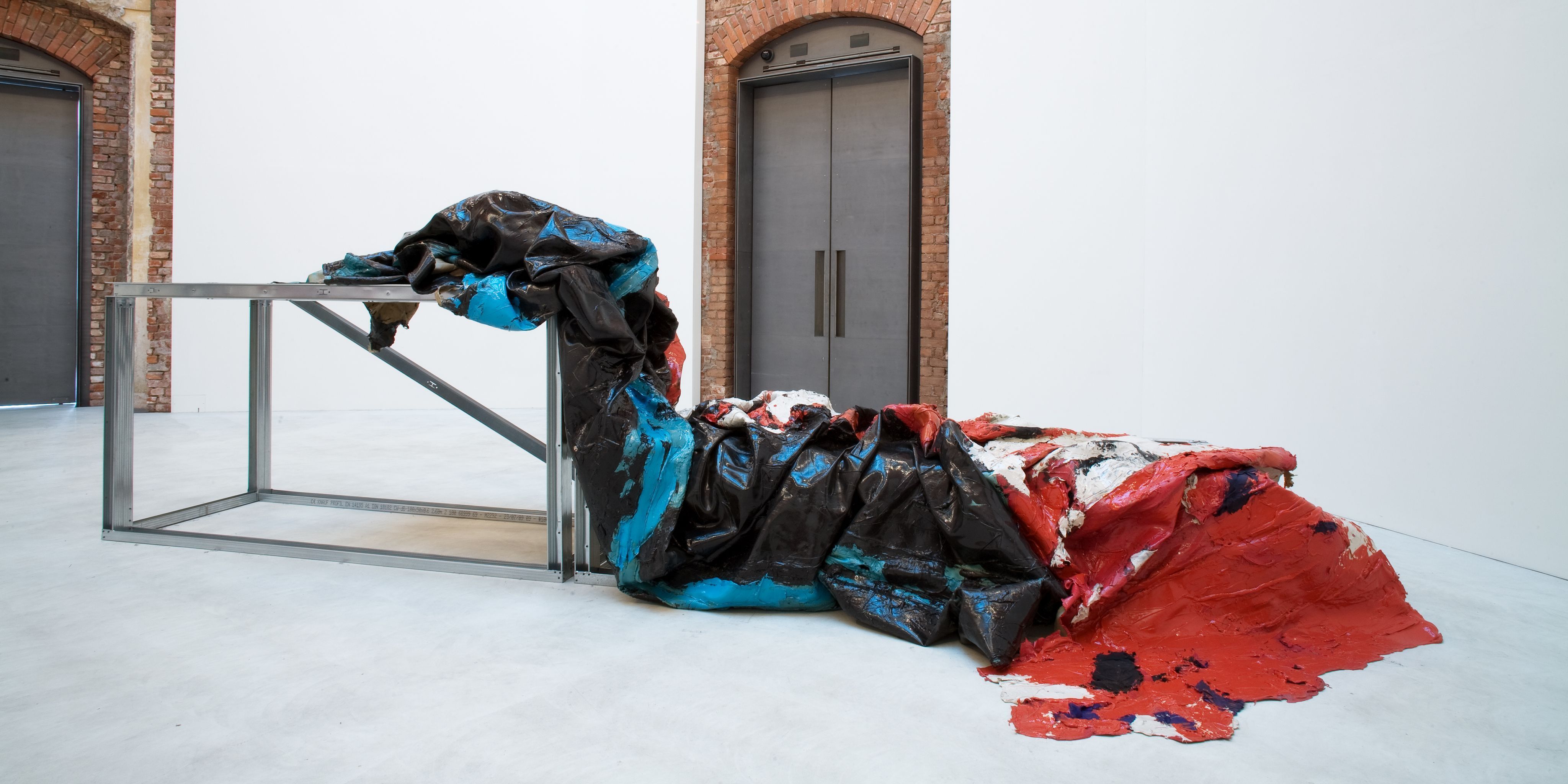 SC: Das ist ein Zitat nach etwas und die die Struktur gibt vor. Es werden zum Beispiel Podeste gebaut, die einfach nur die Struktur der Arbeiten zeigen, auch aus diesen C-Profilen. Oder Räume, Tragkonstruktionen, Podeste, die nur aus C-Profilen gebaut werden. Die sind im Grunde auch nur ein Skelett. Dann gibt es Material, das voll ist, das regelrecht eine Plattform ausbildet. Es gibt auch Arbeiten, da habe ich Mobiliar verarbeitet. Mitte der 90er Jahre wurde auch Mobiliar mitvermalt. Ich habe zum Beispiel mittels meiner Vorgehensweise über Computer oder Bürotische hinweg gemalt. Daraufhin wurde das Material wieder in einen losgelösten, abgelösten Zustand aufgebaut. Als Beispiel Möbel-Schrott, über den ich die Mal-Haut dann wieder darüber warf. Es gab immer verschiedenste Zustände. Wenn man jetzt durch die Kataloge schweift, dann kann man das alles ein bisschen sehen. Über die Arbeiten, über die wir gesprochen haben, oder die, die Anfang der 90er endstanden sind. Da war so eine ehemalige Fabrik, wo ich in einem Büroraum die ganze Seitenwand komplett durchgemalt habe. Die Arbeit hat vier, oder eigentlich sogar fünf verschiedene Präsentationsformen durchlaufen. Bei der ersten wurde die Haut eigentlich nur abgenommen und auf den Boden fallen gelassen, so dass sie in ihrer Faltung einfach nur da lag. Dann wurde sie auf einer Platte aufgebracht und wieder in ein Formatgesetzt. Dann wurde diese zerknautschte Arbeit aus diesem Zustand zusammengefaltet wie ein Sandwich und lag da, wie ein Auto, das nicht mehr fährt. Es war aufgebockt, und aus dem heraus (…) habe ich es noch einmal reduziert, eigentlich zerstört, weil mir da irgendwie zu viel an (…) Wesen hineinkam. Dann habe ich die Arbeit einfach zerschnitten und habe die eine Fläche weggetrennt und weggeschmissen. Damit ich auch gar nicht mehr in den Versuch komme, da ein Sandwich daraus zu machen. Und ja, dann steht da einfach nur dieses nackte Teil da. Was immer das dann noch sein könnte.