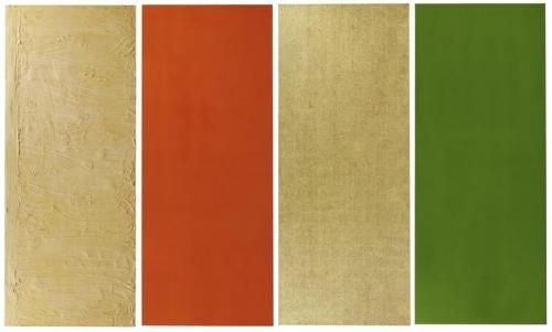 GF: Ja. Man kann jetzt zum Beispiel über ein Bild reden, bei dem dann Teile bemalt sind. Dann gibt es eine Goldfläche, dann ist das Bild vier- oder fünfteilig, ja. Ich habe damals Farbfelder gemacht auf Holzplatten, in fünf Flächen eingeteilt, ein Teil war bemalt, dann gibt es auch manche auf unbemaltem Holz, dann gab es ein Goldfeld drauf. Das sind so Sachen, die von der Wandmalerei her kamen.